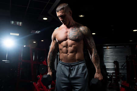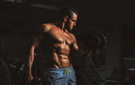 Bodybuilder training biceps in gym with dumbbells exercises. Sportsman with shirtless torso. Sporty workout. Athletic body.