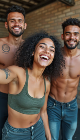 Three friends, two men and one woman, are smiling brightly while taking a selfie in a casual setting. Their infectious laughter and vibrant energy radiate joy, showcasing a moment of friendship and carefree fun.