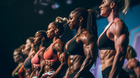 Bodybuilders Line Up On Stage At Competition