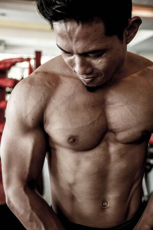 Close up muscular man is exercise in fitness gym