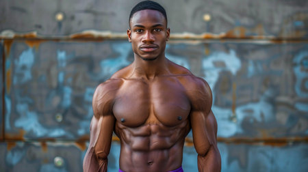 A strong man with no shirt on confidently poses for a photo, showing his toned physique and confidence.