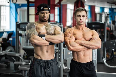Developing muscular strength and power. strong and fit men bodybuilders. twins muscular men. athletic man sexy body. Sporty muscular guys with barbell and dumbbells. twins training together