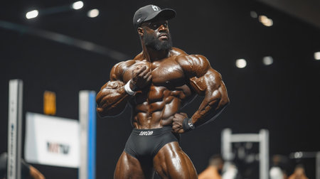 A powerful pose of a bodybuilder showcasing their sculpted abs in a fitness competition.