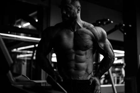 strong young athlete with beard showing his powerful muscular body in night training sport fitness gym