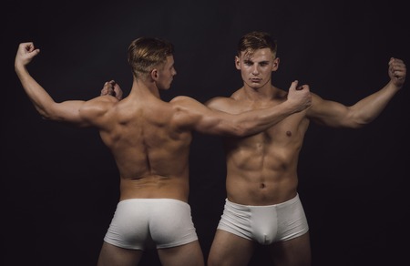 bodybuilder twins with sexy muscular body. bodybuilder men in white pants