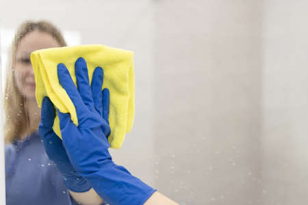 A woman is cleaning the bathroom by wiping it with a countertop rag. Disinfection with yellow rubber gloves in the washroom