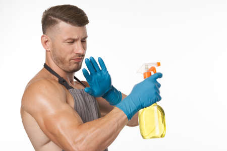 Woman in protective gloves with spray bottle. Commercial cleaning company concept. Maid or houseman cares about house. General or regular clean up. High quality photo