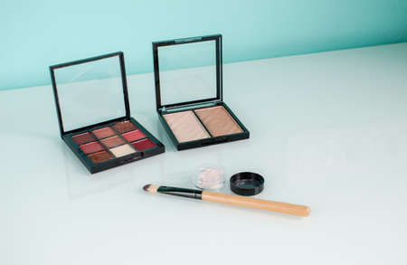 Makeup beauty cosmetics tools, products & facial cosmetics, sculptor, eye shadow stick, highlighter palette on white table. Wood brush and can of mineral powder.