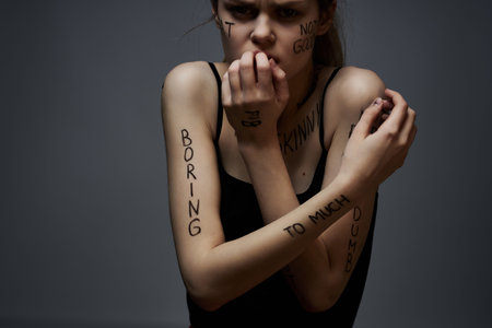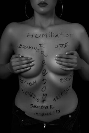 part of the body of a young girl with the inscription, humiliation, bullying, freedom, racism, violence . the captions are written in the photographer's hand, not in a tattoo . black and white photo.