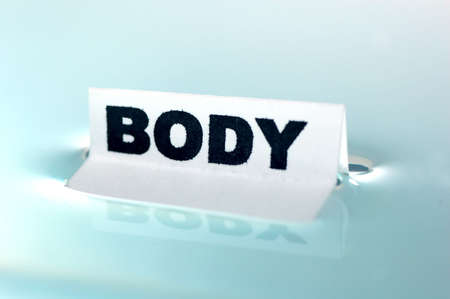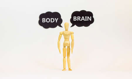 Brain or body symbol. Wooden model of businessman human. Black paper with words 'brain body'. Beautiful white background, copy space. Business, psychological and brain or body concept.