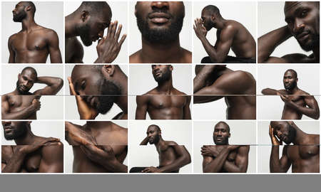 Collage. Different body parts, portraits of young muscular african man posing isolated over white studio background