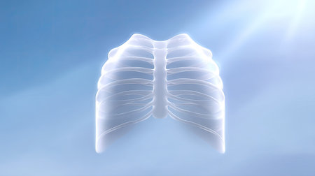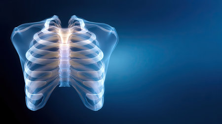 A detailed illustration of the human rib cage anatomy presented with a translucent effect against a blue background, ideal for medical education and scientific purposes.