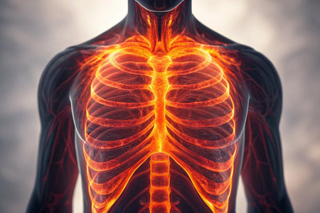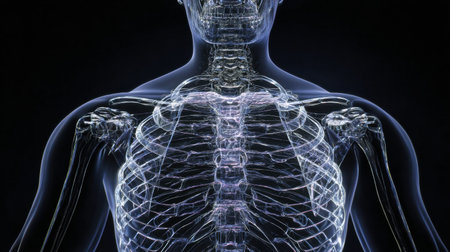 Illustration highlights the intricate details of the human skeletal system, focusing on the ribcage and spine in a dark background, emphasizing anatomy.