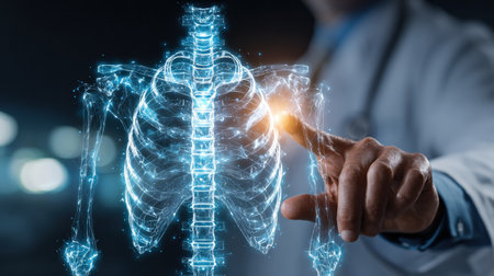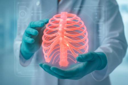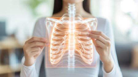 AI generated futuristic medical scene showing a protective gesture by a doctor's hands holding a glowing ribcage in digital hologram form. Soft lighting high-tech elements safety advanced diagnostics.