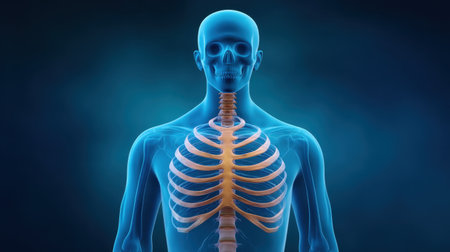This image features a detailed 3D render of the human skeleton, highlighting the rib cage, spine, and skull. Ideal for educational purposes in biology and healthcare.