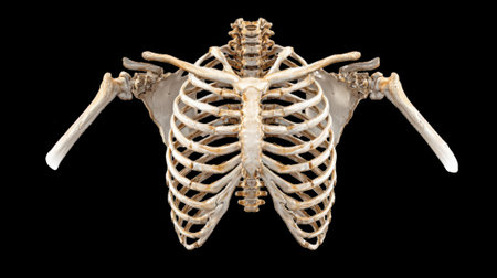 This image showcases a detailed human rib cage against a black background, highlighting the intricate anatomy and structure of the bones for educational and artistic purposes.