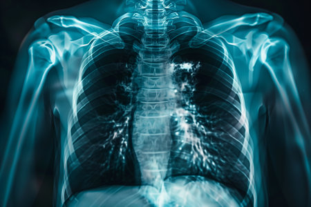 X-ray image of a human chest and spine, displaying detailed bone structure. Concept of medical imaging, radiology, human anatomy, diagnostic tool.