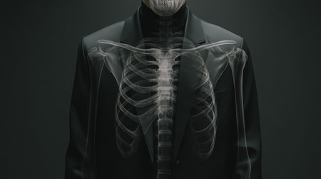 Man wearing black suit with transparent x ray effect showing skeleton ribs and spine in dark background