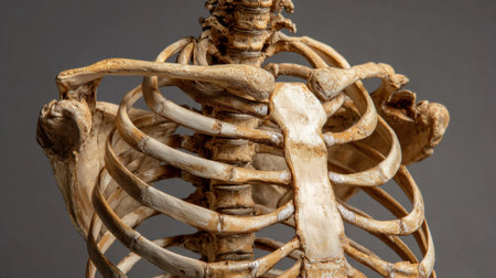 A highly detailed anatomical model showcasing the human skeleton, focusing on the rib cage, spine, and clavicle. Ideal for educational and medical contexts, isolated against a neutral background.