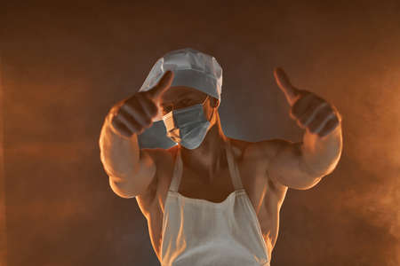 New normal concept. Portrait of muscular chef wearing protective medical mask white apron and chef hat, showing thumb up on smoky background male housewife. husband in kitchen. brutal butcher.
