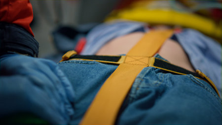 Unrecognizable emergency medical doctor in gloves doing medical checkup of patient. Closeup medical worker hands examining man body for broken bones after car accident in emergency car. Urgent help