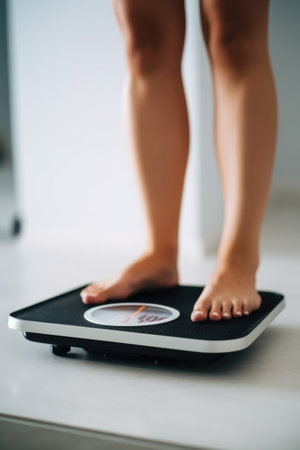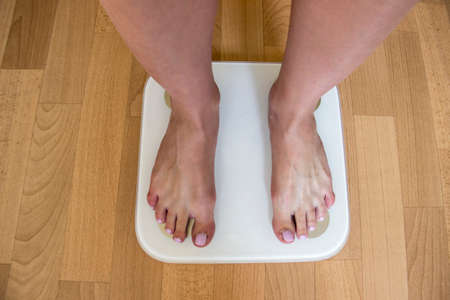 Cropped image of women standing on the scales, on a light background. Feet taped measure side view.