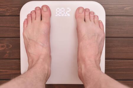Man weighing himself - male bare feet stepping on white digital floor scales at home: close up view. Measuring weight, control, wellness and diet concept.