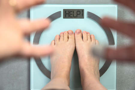 Person Feet on digital weight scale with the words help, worried hands showing, top view diet and health concept