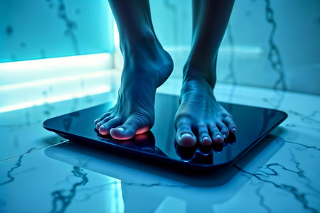 Male feet on the digital weight scales. The digital scales display the weight as the man stands confidently, reflecting his commitment to a healthy lifestyle.