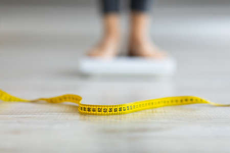 Measuring tape on floor and blurred view of millennial woman on scales, checking result of her slimming diet