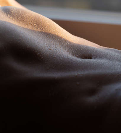 Close up of fit woman torso with sweat on skin after workout. Female with perfect abdomen muscles