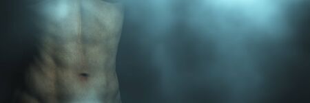 Muscular mans torso in low light, highlighting abs and muscle definition