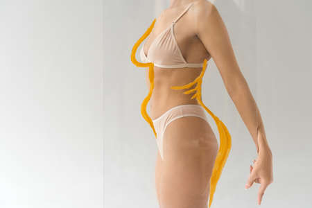 Close up conceptual tummy tuck surgical contour lines on female torso. Body part of woman standing on beach against out of focus ocean background.