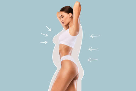 slim girl showing her slim waste, fat stomach. close up cropped photo. ideal body, isolated blue background, studio shot