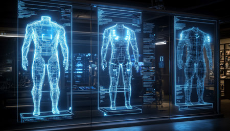 A digital human body hologram with glowing circuits and data patterns, representing advanced technology and health concepts