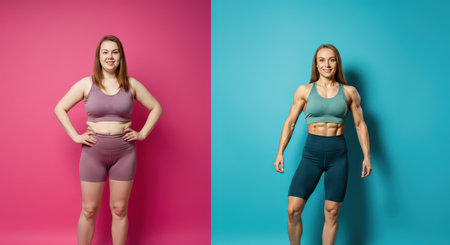 Transformation journey of two young caucasian women in fitness attire on colorful backgrounds