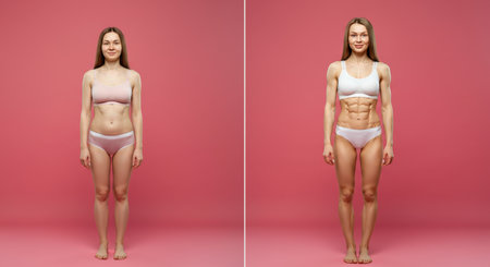 Transformation journey of a young caucasian female in fitness before and after concept