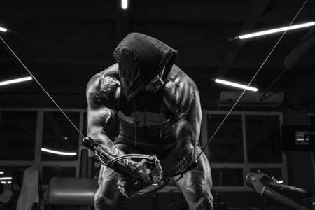 Image of a powerful athlete in a hoodie exercising in a crossover at the gym. Fitness and bodybuilding concept. Mixed media