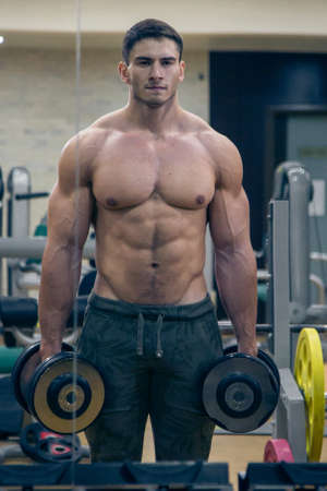 Bodybuilder training biceps in gym with dumbbells exercises. Sportsman with shirtless torso. Sporty workout. Athletic body.