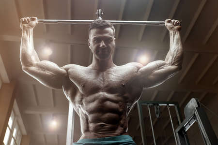Handsome strong athletic men pumping up back muscles workout fitness and bodybuilding concept background - muscular bodybuilder fitness men doing pull-ups exercises in gym naked torso