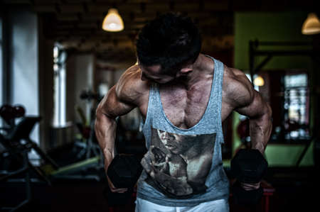 Strong man with dumbbells in gym. Bodybuilder training biceps by workout exercises. Sportsman with athletic body.