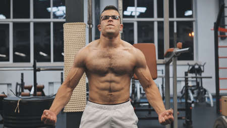 Brutal adult athlete posing in the gym. Fitness muscled man.