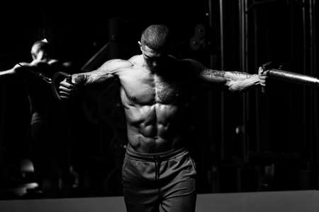 Handsome Muscular Fitness Bodybuilder Doing Heavy Weight Exercise For Chest On Machine With Cable In The Gym