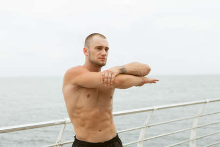 Muscular man with a naked torso doing hand stretch before training on the beach