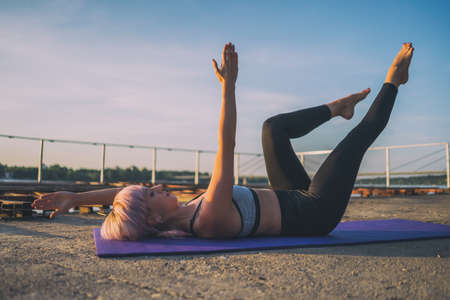 Young caucasian blond fitness woman training abdominal muscles while lies on mat on concrete floor. healthy lifestyle