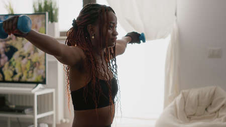 Tired African american woman working out in home livingroom gym with dumbbell in font view focus