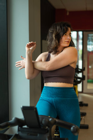 female stretching on a bike in a gym