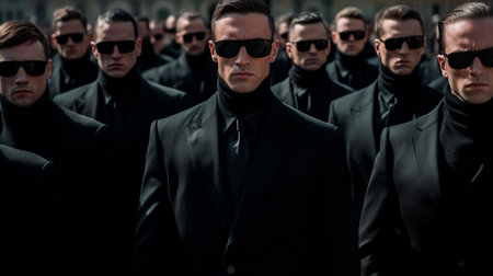 A picture of a group of men dressed in suits and wearing sunglasses. This image can be used to depict a business team, professionals, or a secret agent group. Ideal for corporate presentations, marketing materials, or spy-themed designs.