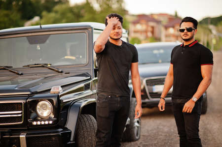 Two asian brothers man wear on all black posed near suv cars.