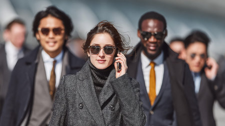 A stylish woman on the phone leads a diverse group of professionals through a busy city street.